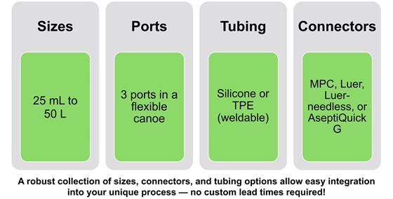 Offered in sizes ranging from 25 mL to 50 L with configurable port and tubing options, they deliver custom solutions at off-the-shelf lead times and are validated with 100% seal‑integrity testing to support your entire workflow.